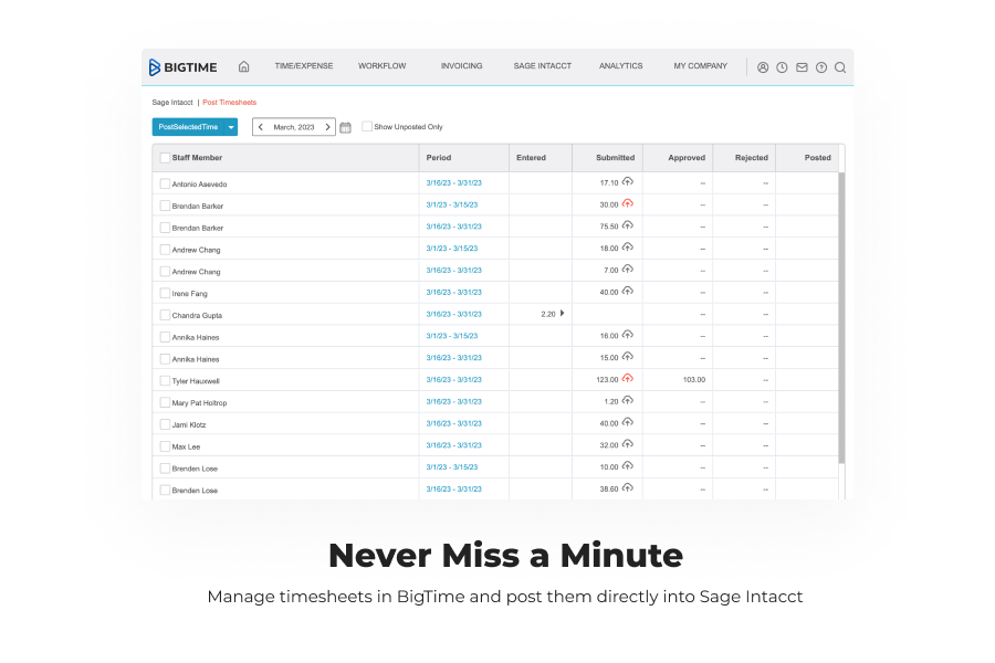 Streamline operations, improve productivity, and boost profitability. Sage Intacct users can seamlessly synchronize accounting, project, employee, client, and financial data and manage it from a single location, BigTime, for a real-time, contextualized view of business performance.