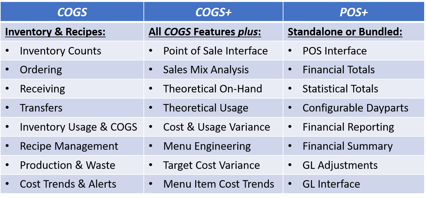 COGS-Well provides comprehensive inventory control, recipe management, and food cost analysis software for the restaurant industry. We interface with Point of Sale systems to collect product mix and sales information and we post cost of goods sold adjustments, audited POS financial totals to Sage Intacct General Ledger. We also post vendor invoices to Sage Intacct Accounts Payable.
