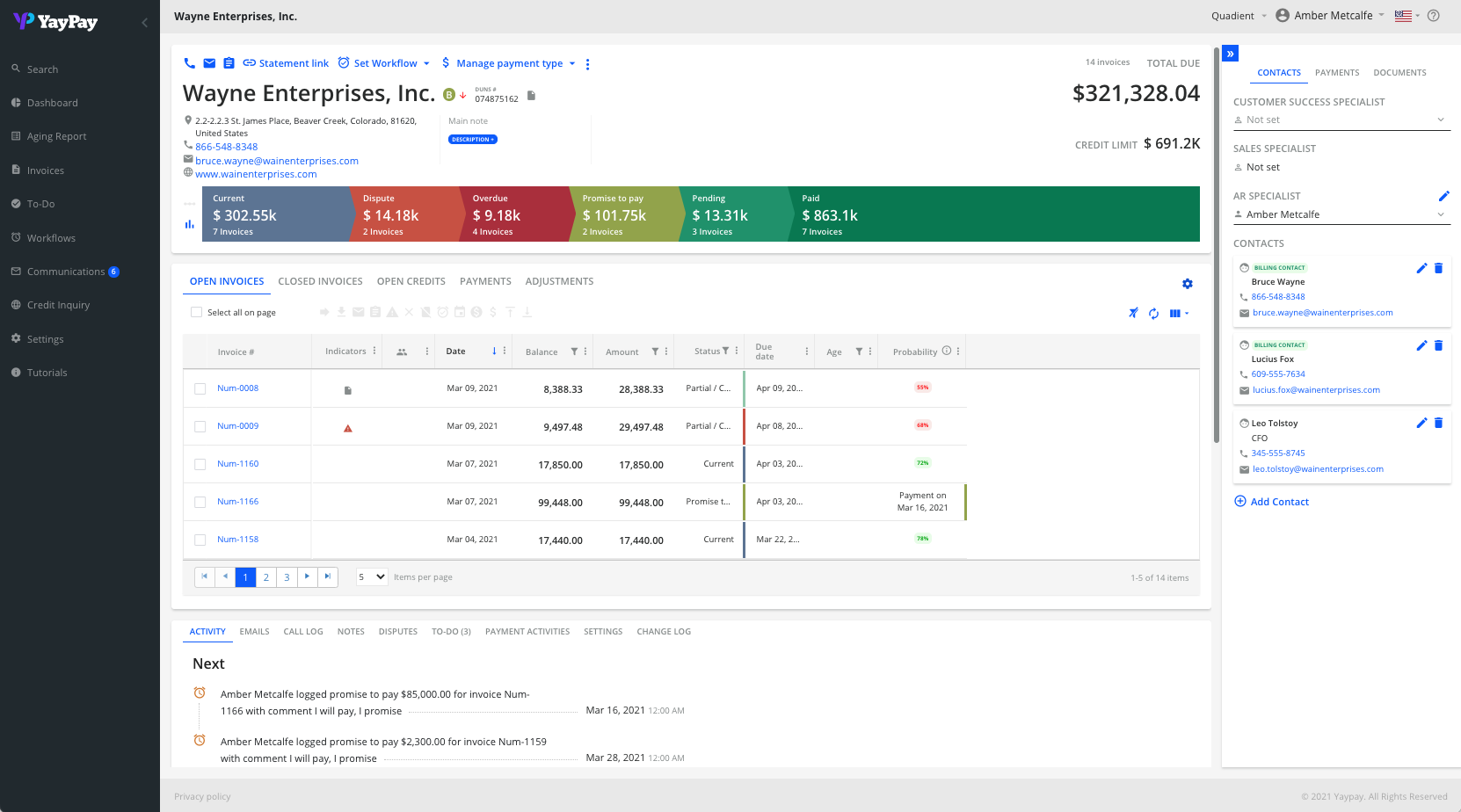 Build intelligent and highly personalized collection workflows, report on all your AR data in real-time with customizable dashboards, apply cash automatically, assess customer payment scores and credit in seconds, and so much more. Our secure, online payment portal also enables your customers to access their accounts and pay at any time, from anywhere.