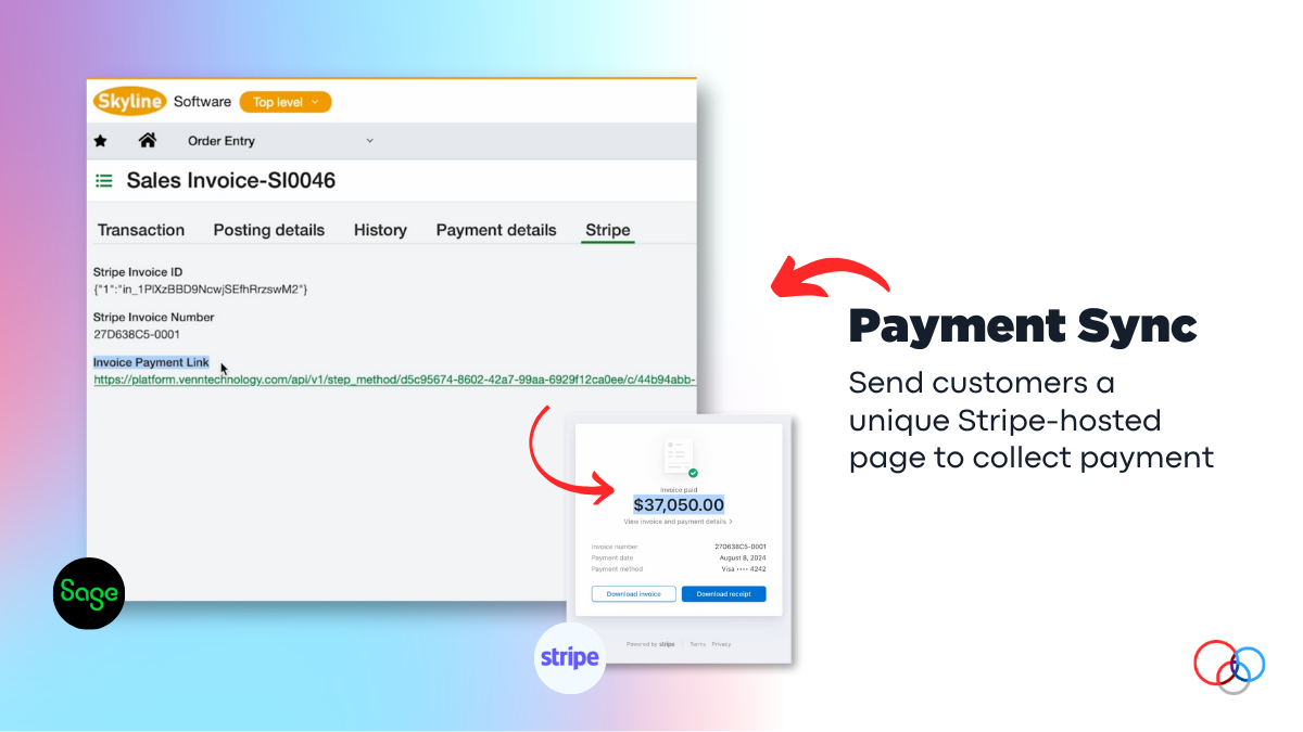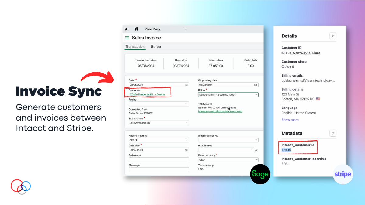 Venn Technology integrations are built for scaling teams that need an automated way to manage subscriptions in Stripe and collect payments out of Sage Intacct.