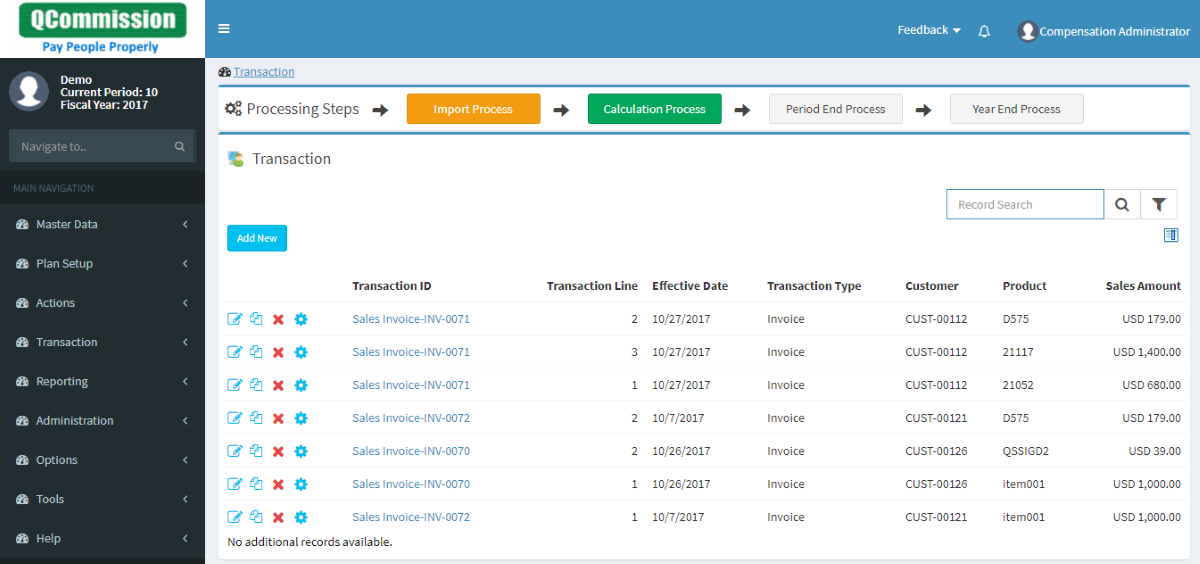 QCommission allows the compensation administrator to establish payees, products, customers, plans, incentives, quotas, payment frequency, and many more inside the system.