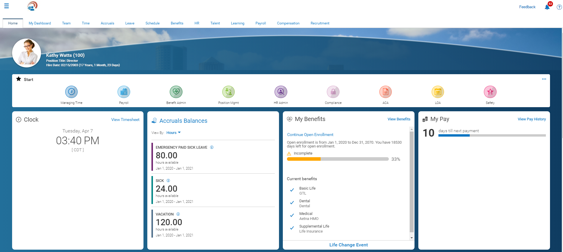 - A single database – hosted in the cloud – for Payroll, HR, Time & Attendance, Scheduling, Benefits, and more! Accessible anywhere, any time.