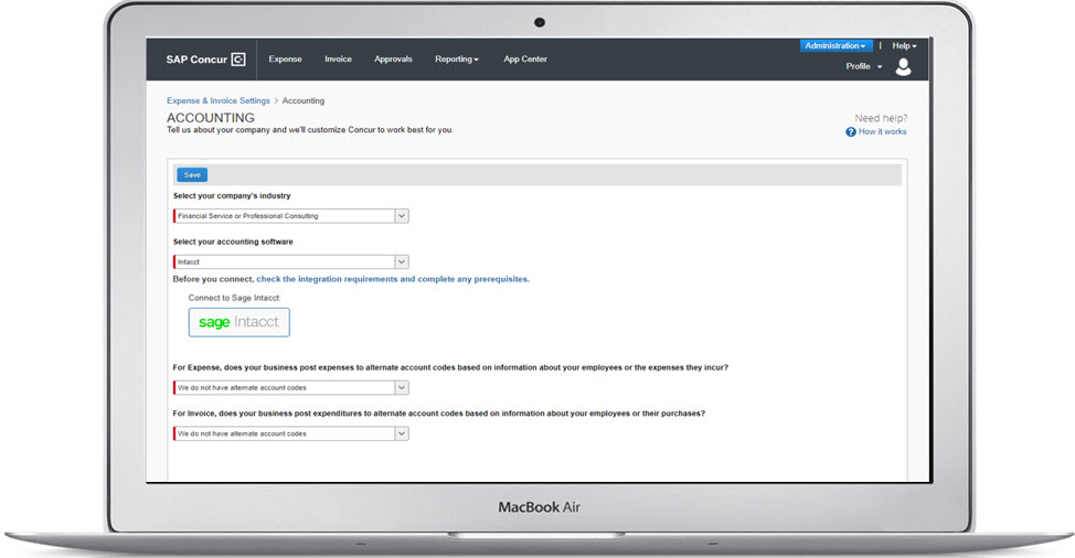 With a Sage Intacct direct integration developed by SAP Concur, SAP Concur automatically collects all Account Codes, dimension lists, and vendors directly from Sage Intacct. Instantly post back bills to the Accounts Payable Module and credit card transactions back to the Cash Management Module in Sage Intacct in near real-time. Benefits of the SAP Concur Sage Intacct integration include: