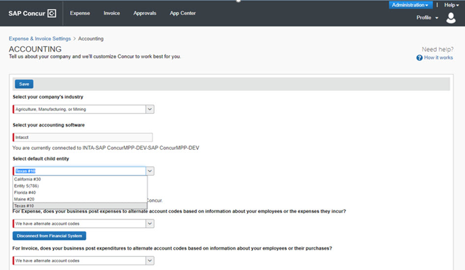 Customers can sync at the Top Level or up to 10 entities to one SAP Concur company/entity.