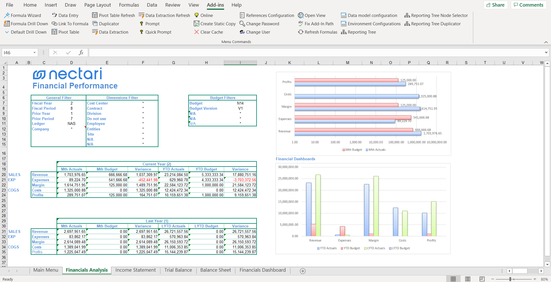 Nectari empowers Sage Intacct users and removes the barrier of relying on IT to provide reports. Users are self-sufficient and can customize views for their specific requirements. Users can work in the Nectari Excel Add-In or bring Excel functionality to the web with Nectari Workbooks. Access your data and eliminate the need to update worksheets manually. Create dynamic ad-hoc reports by combining data into a single worksheet where you can perform mathematical calculations and drill down into the details.