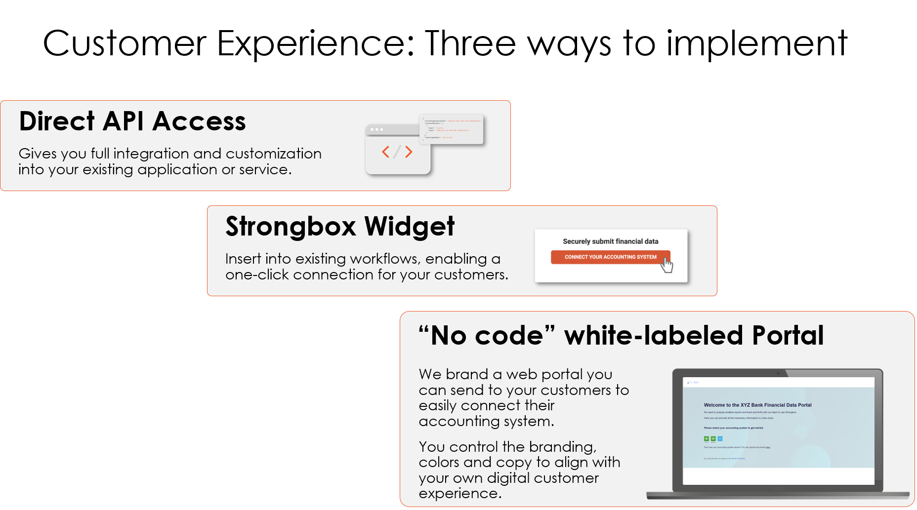 Strongbox is a platform that collects and analyzes financial data from a business’ accounting system. Strongbox outputs are used by credit teams to standardize decisioning criteria and automate risk analysis as well as M&A teams to streamline financial due diligence. The benefits for businesses are realized through the easy, one-click interface to securely provide financial information to authorized third parties.