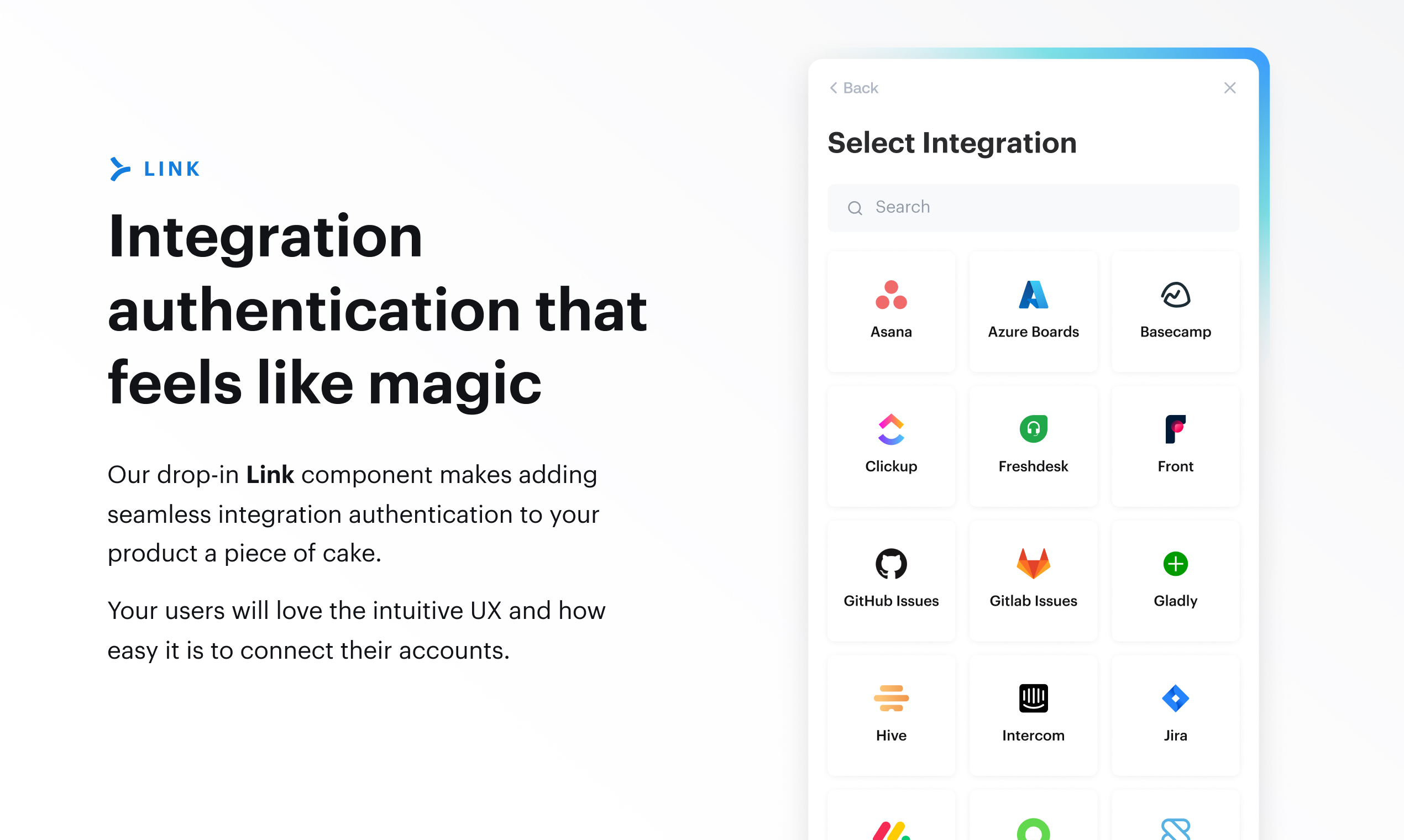 • Merge Link: Your users authorize integrations via a drop-in component in your app.
