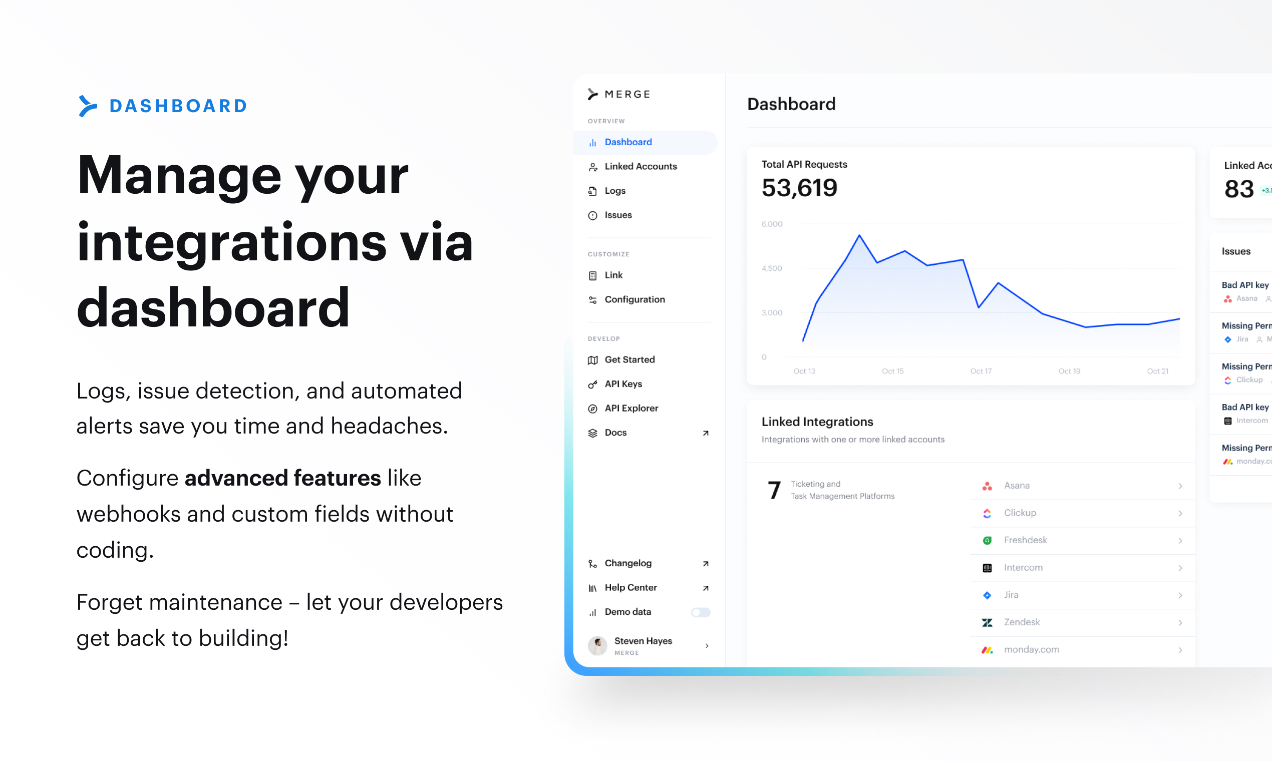 Merge also provides tools to manage integrations, with a robust dashboard that allows users to control the scope of data being synced through Merge, configure webhooks, and troubleshoot and resolve issues such as expired API keys and more without the use of engineering resources.