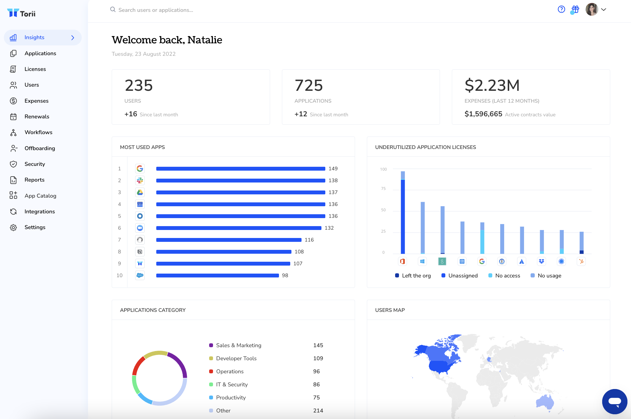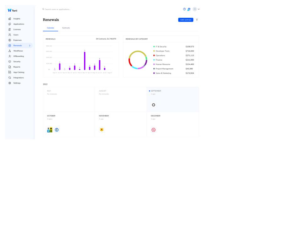 Torii is the world’s only Distributed SaaS Management Platform built for the new digital workplace where anyone can sign up for apps and everyone needs to stay in perfect sync. Unlike other tools, Torii’s complete SaaS management platform discovers new app signups as soon as they occur, unifies actionable user, spend and app insights, recommends cost-saving actions, and empowers cross-functional teams with fully automated and highly customizable workflows. Torii’s customers eliminate millions of dollars in wasted spend, automate hundreds of hours of manual tasks, and protect their sensitive data with instant Shadow IT discovery and risk insights. Torii is a great fit for companies looking to maximize the ROI they see from their SaaS stack.
