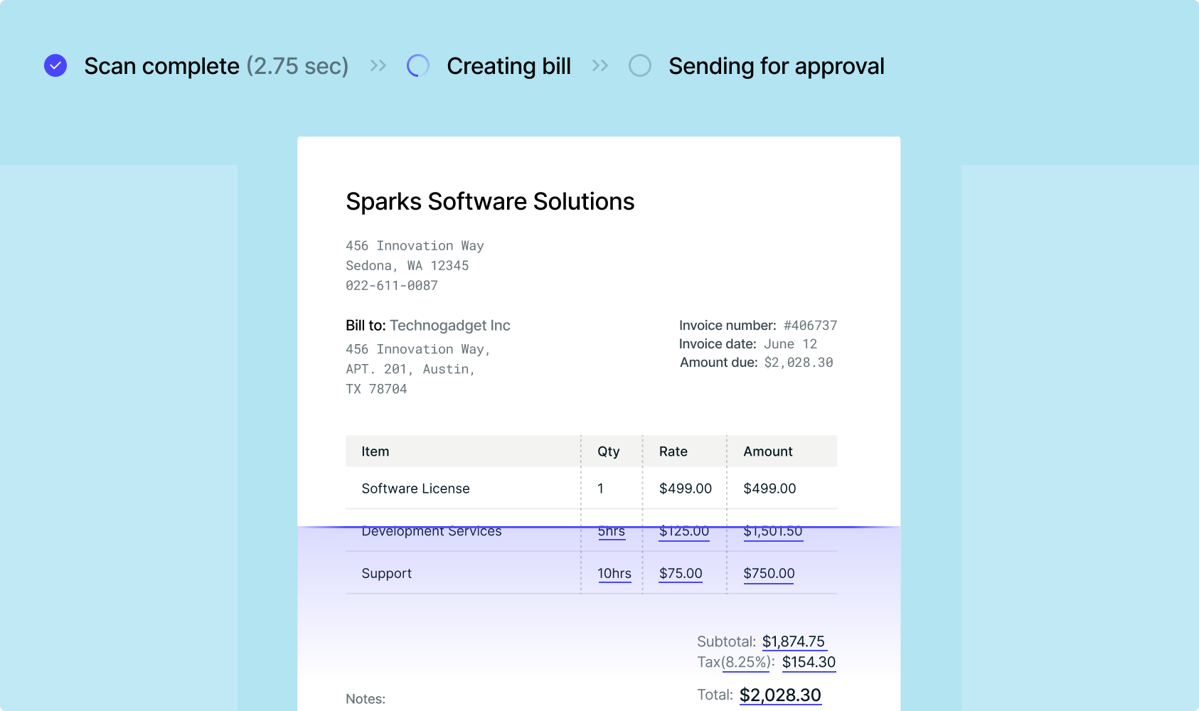 • AI OCR extracts invoice data, then autopopulates your bill with 92% accuracy