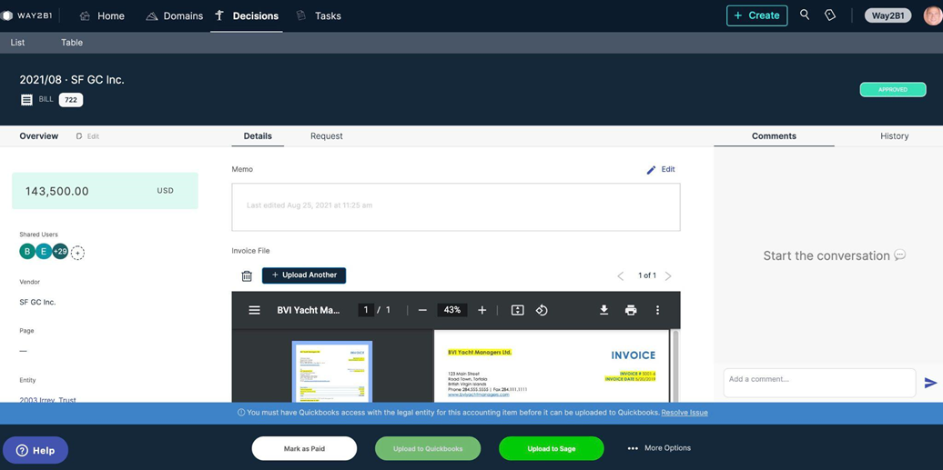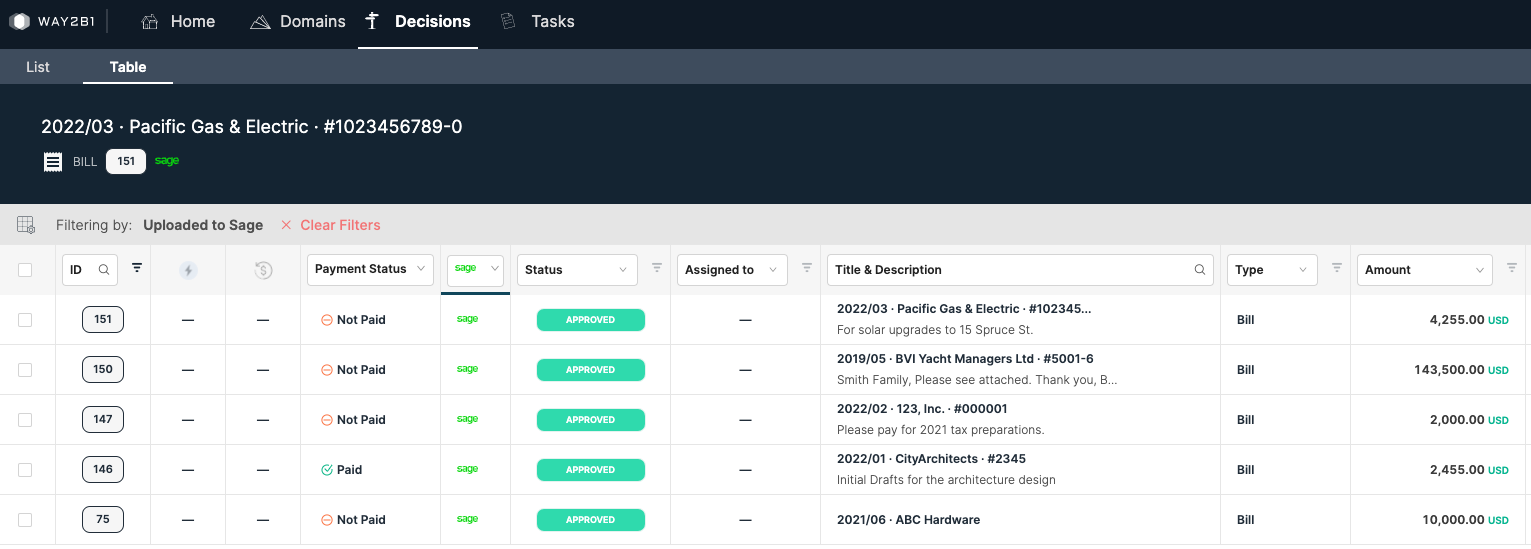 Decisions gives families and individuals control of their expenditures, investments, philanthropic goals and more. By consolidating communication, documentation, and due diligence. Decisions brings clarity and efficiency to the workflow approvals and can be sent directly to Sage Intacct for payment and bookkeeping. Families and their teams can securely access critical information to make better decisions together.