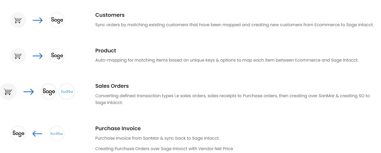 - Keeps your eCommerce sales order conversion to purchase orders synchronized from to SanMar, Sage Intacct with custom settings.