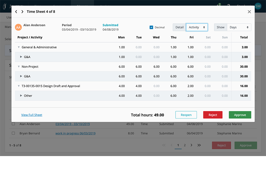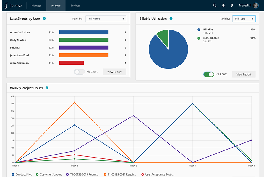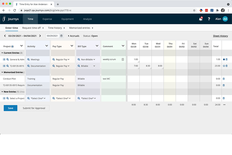Journyx has the versatility to track and report on employee time for any business situation, from the simple to the complex. You can track time, expenses, and equipment with as many levels of project work breakdown structure and/or different activity types, accounts, contracts, or other categories as needed. You have the power to customize the timesheet tracking and workflow for each type of employee in your organization.