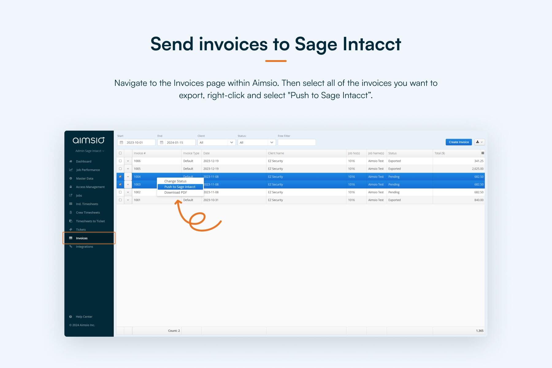 In Aimsio, select all of the invoices you want to export, right-click, and select “Push to Sage Intacct”. Once your invoices have been successfully sent to Sage Intacct, you’ll see their status change to “Exported”.