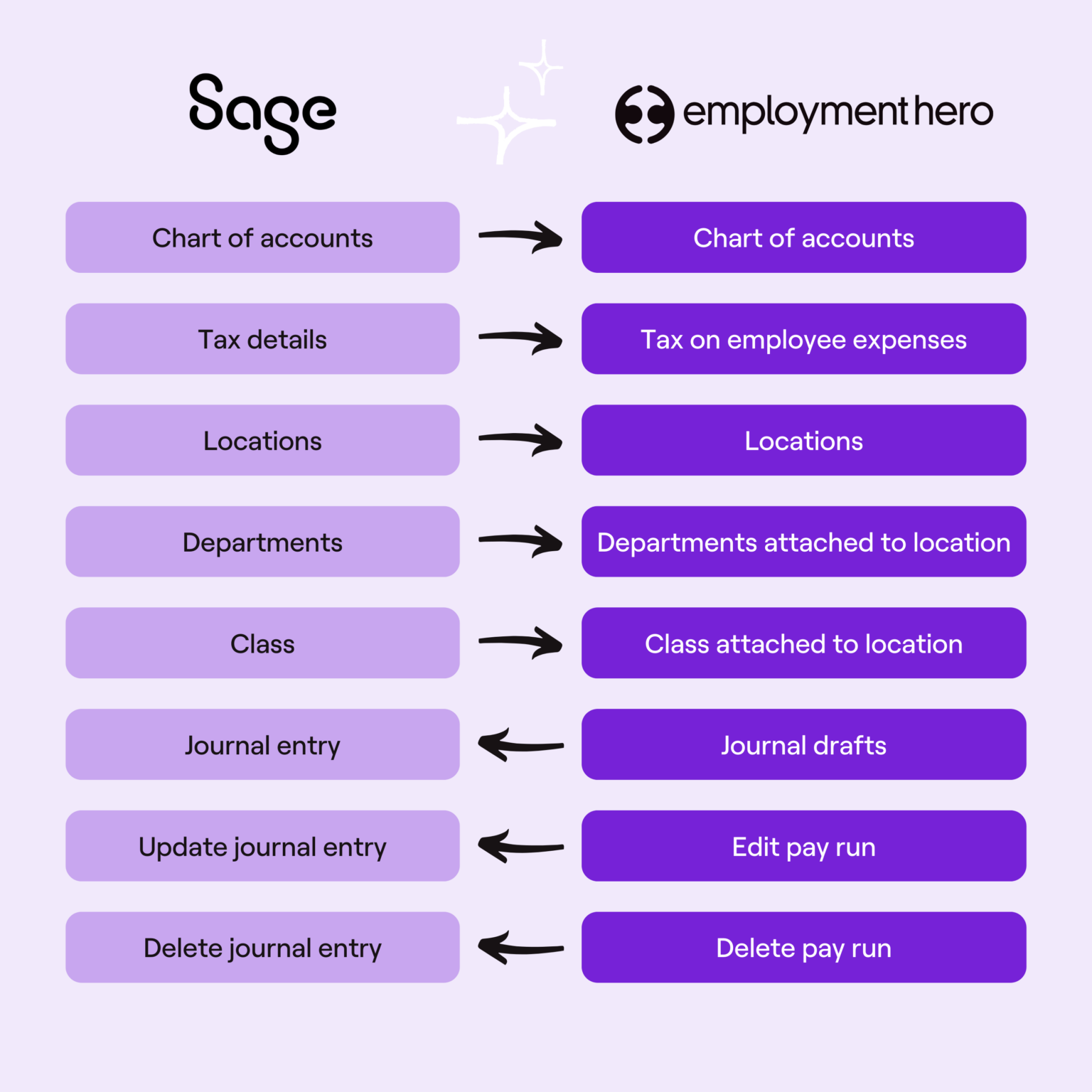 If you’re using Employment Hero Payroll, you can integrate with Sage for accounting functionality. If you’re using Employment Hero HR, you can integrate with Sage for payroll functionality.
