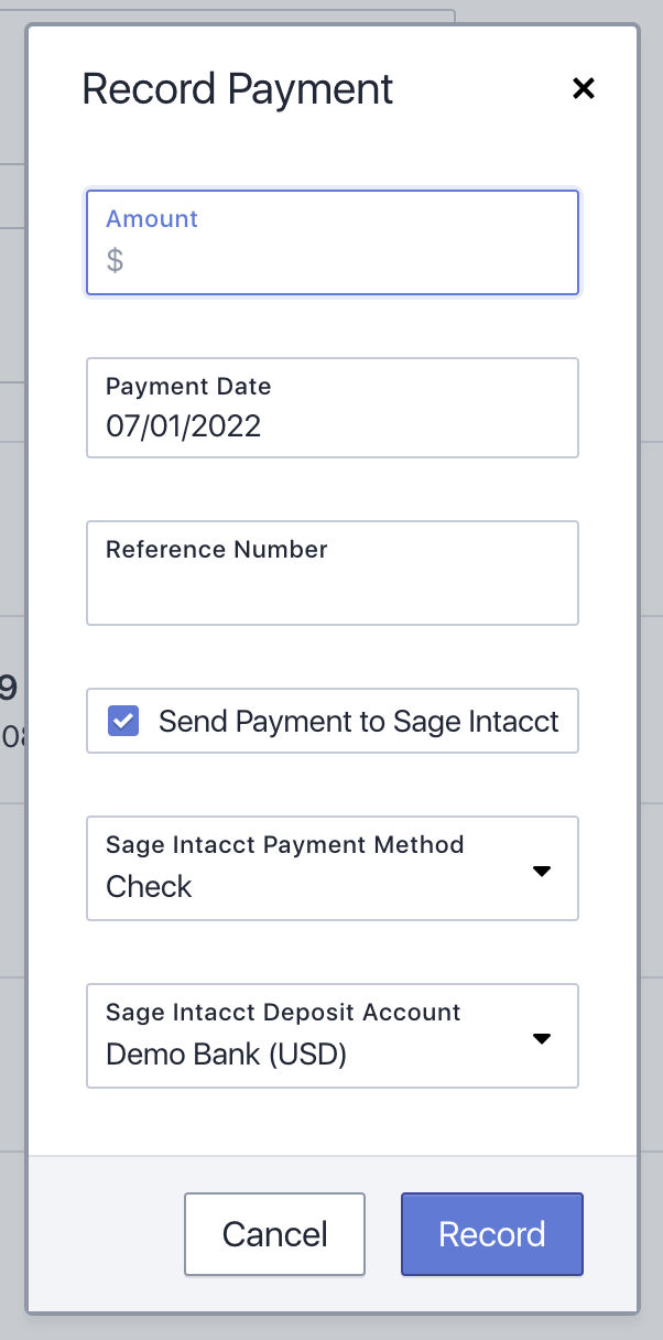 Select a payment method and deposit account to record a payment in Sage Intacct from Canix.