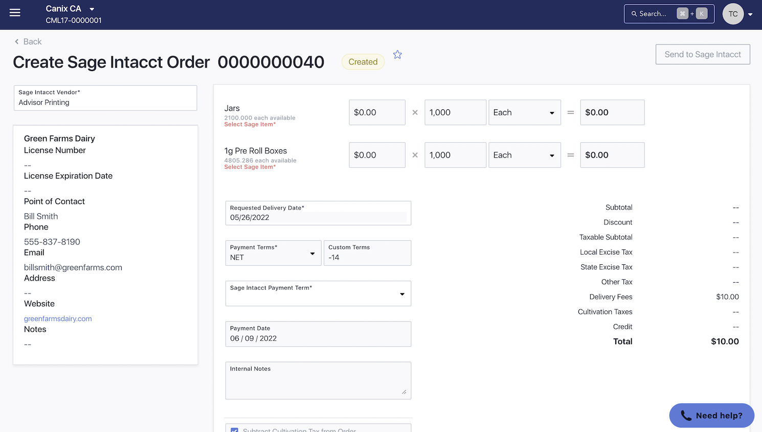 Canix is a cannabis ERP system that integrates with Sage Intacct to seamlessly send Purchase Orders, Sales Order invoices, and payments directly to your general ledger in Sage Intacct. Deal with returns frequently? You can process Sales Order returns as well.