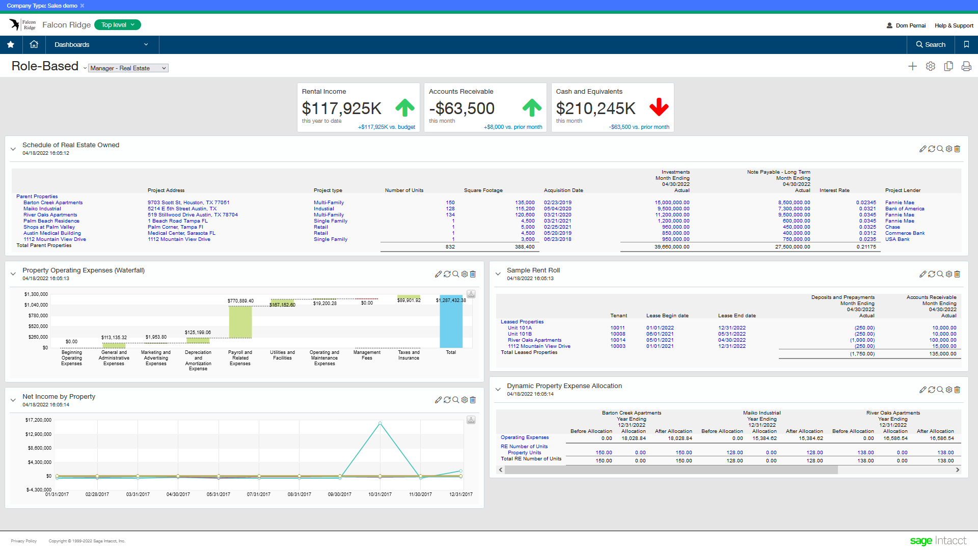 Benefits for everyone.No matter your role, Sage Intacct Real Estate offers deep insights into the financial and operational health of your assets — so you can capture revenue opportunities, monitor and communicate performance, increase property and portfolio value, and grow your business.