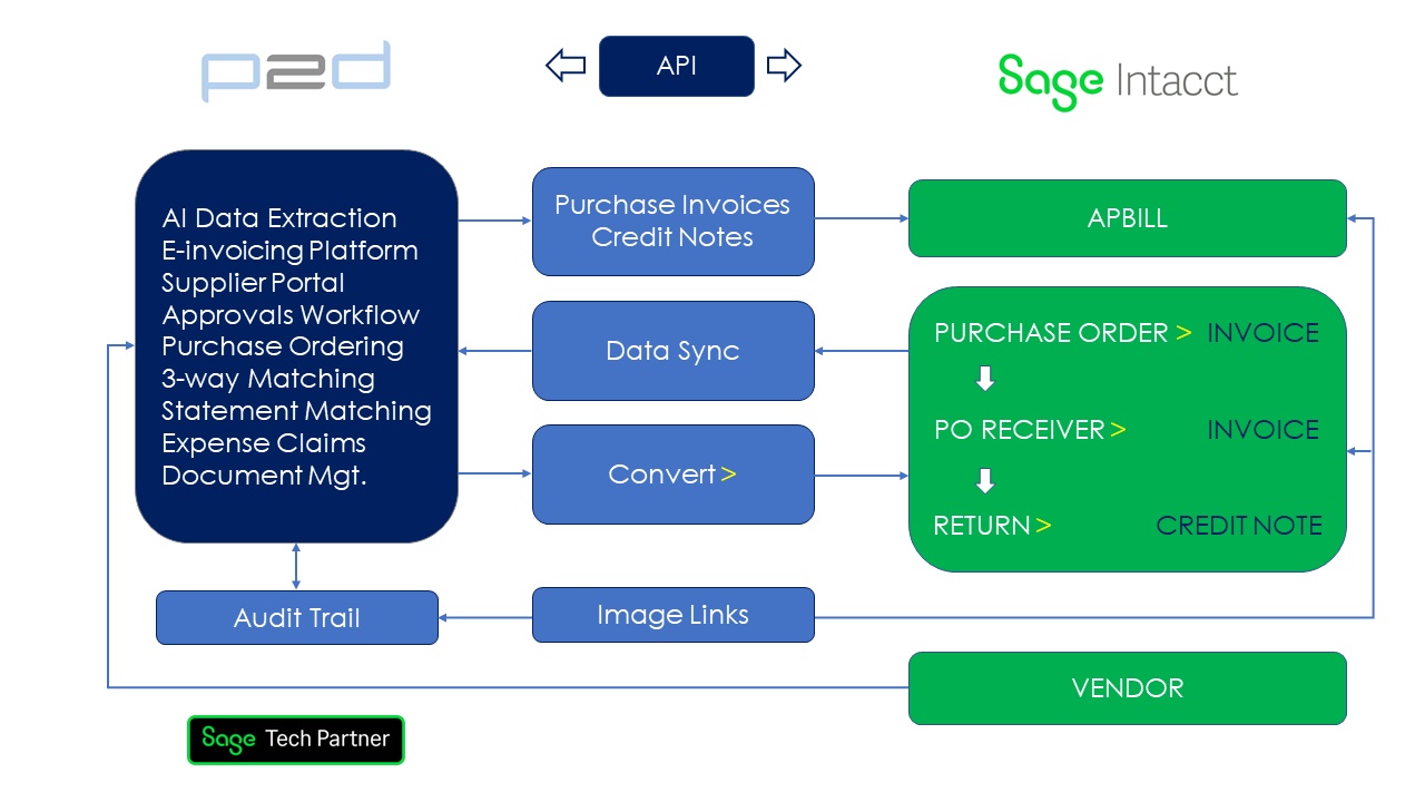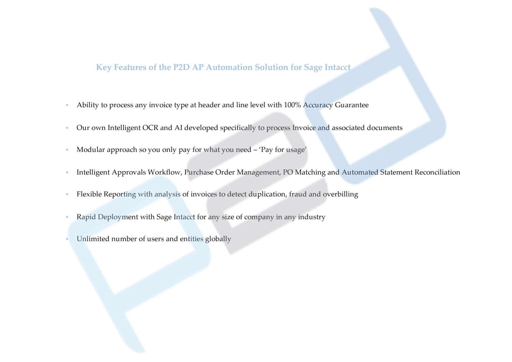 The P2D Intelligent Accounts Payable and modular Purchase-to-Pay solution seamlessly integrates with Sage Intacct to create an easy to use, end-to-end solution.