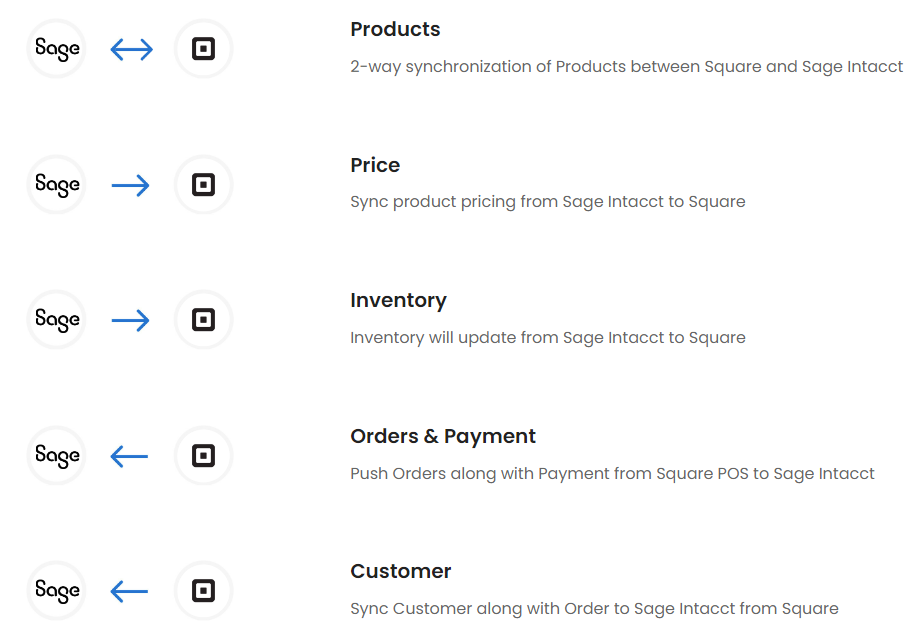 • Easily sync products, inventory levels, and price back and forth between Sage Intacct and Square POS.