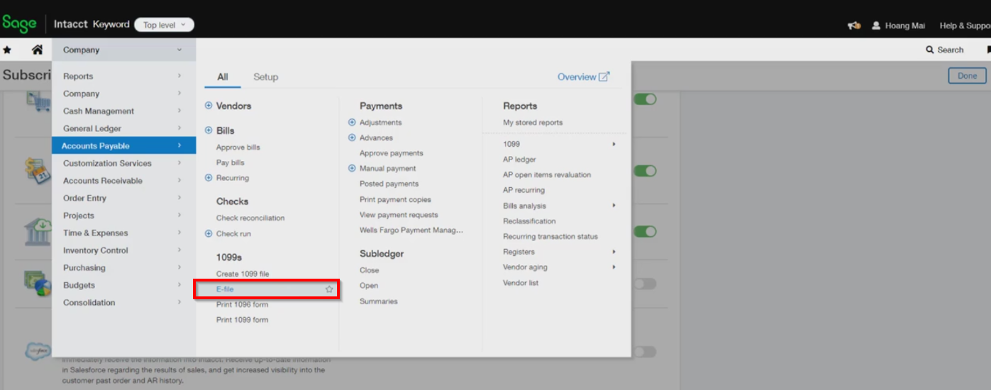 - Once Sage Cloud Service is enabled, click the ‘E-file’ option under the Accounts Payable menu.