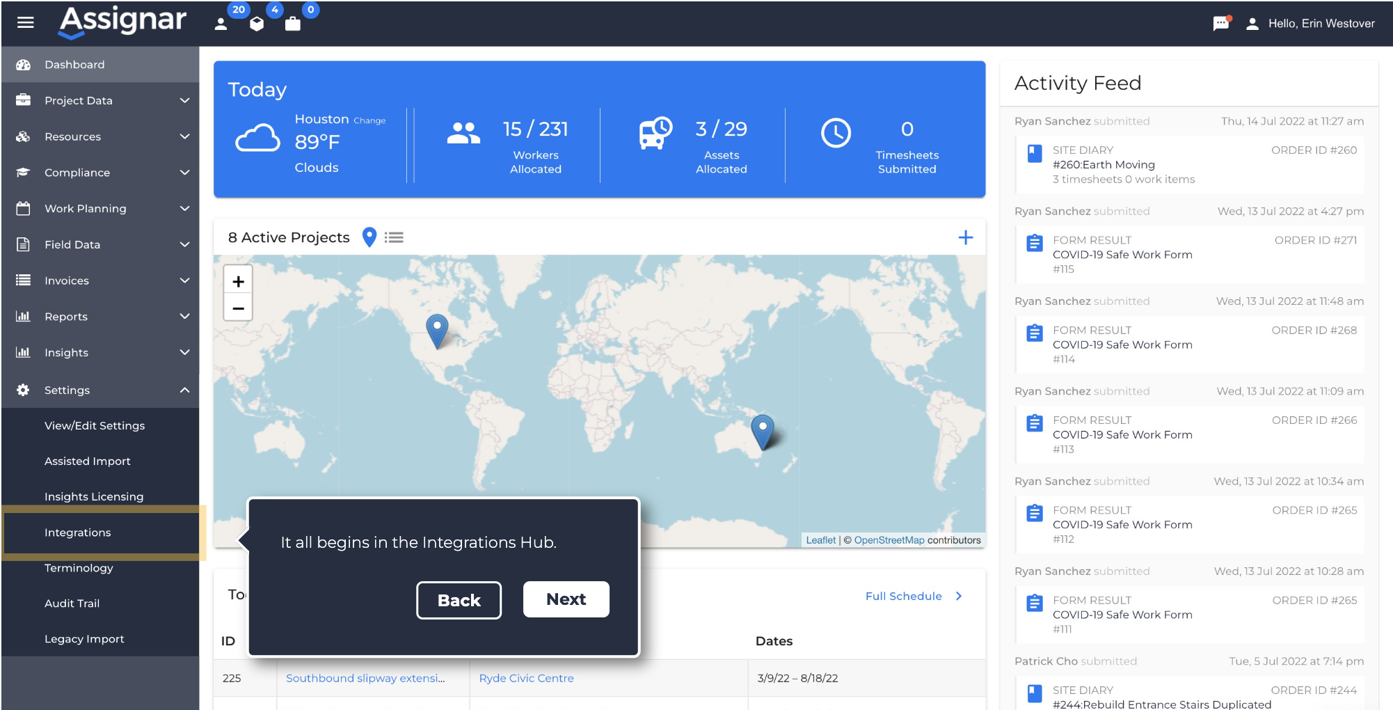 Assignar pulls project data from Sage Intacct Construction, so you can schedule work orders and track time in the field against them. Assignar pushes that field data back automatically, so you don’t have to bother with importing and exporting files.