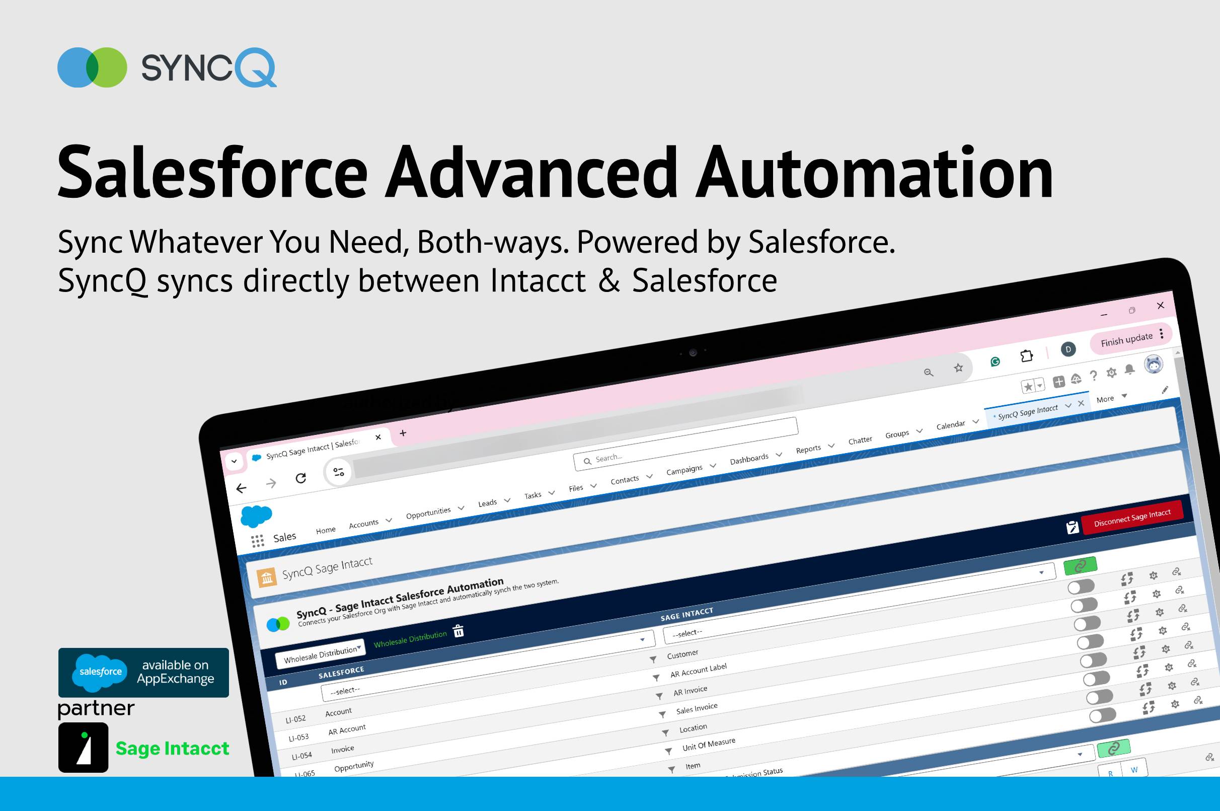 Bi-directional sync between Salesforce and Sage Intacct.