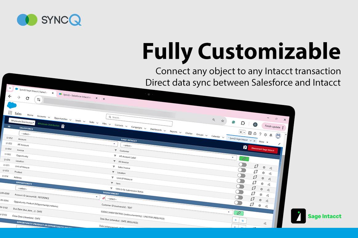 100% Custom & Bi-directional, Seamlessly Sync Any Salesforce Object to Any Sage Intacct Transaction
