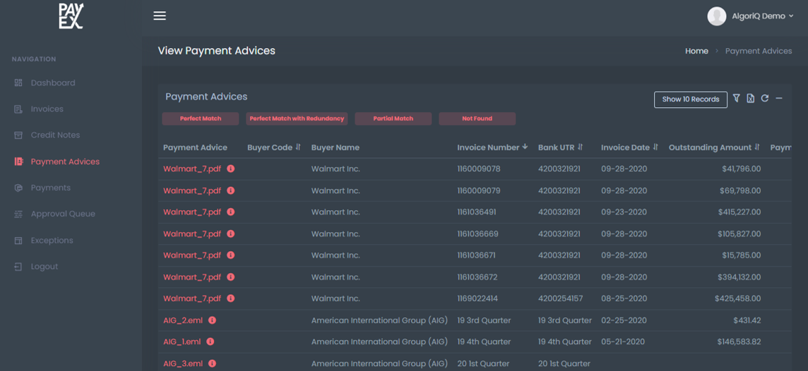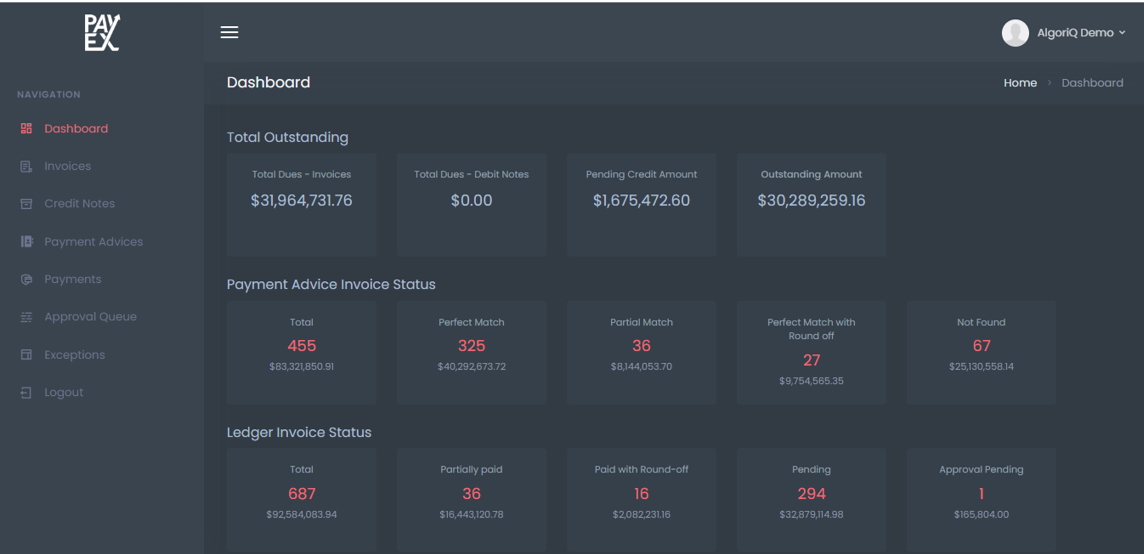 AlgoriQ employs OCR, NLP, and Large Language Models to achieve industry-leading match rates. It provides 2-way and 3-way (expandable to n-way) real-time reconciliation across diverse document formats and provides a hierarchy-based dashboard for AR health.