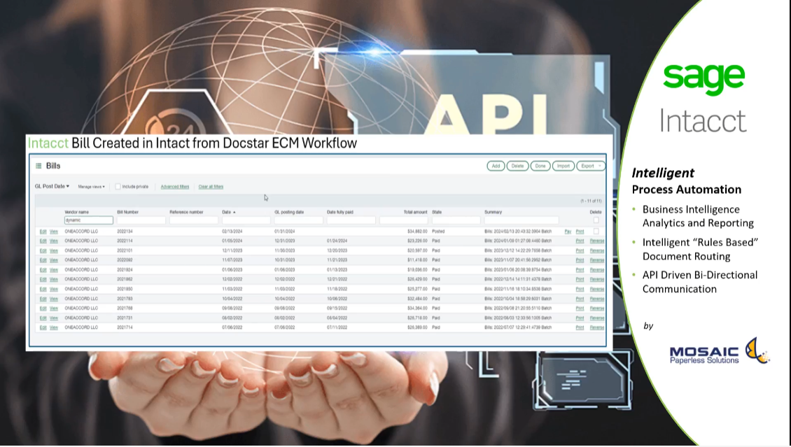 DocStar AP Automation’s powerful workflow engine is supported with an easy to use graphical workflow designer, so your team can learn and create workflows too—no advanced technical skills required. Visit Mosaic to enjoy the benefits of a real-time API-based integration with Sage Intacct!