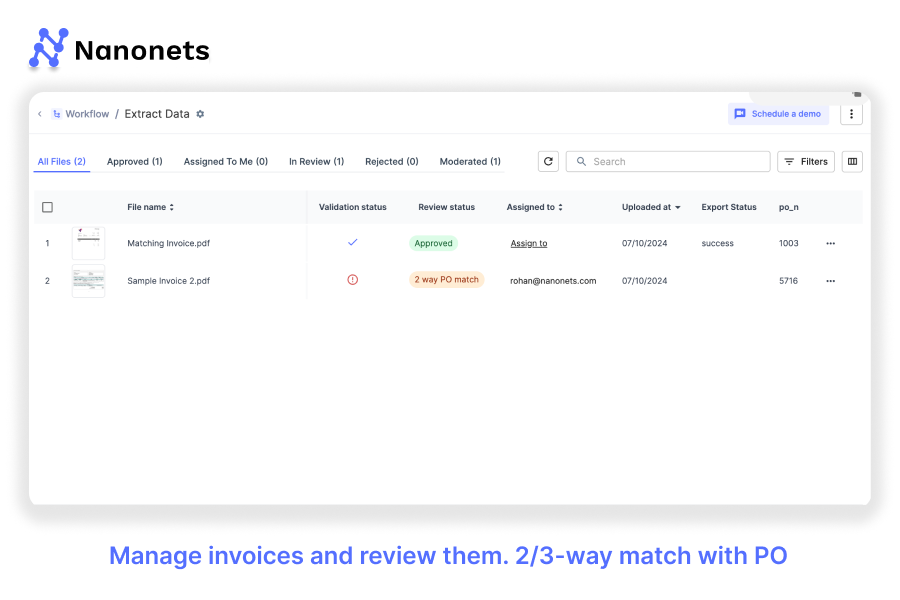 Nanonets' AI-driven platform supports 2-way and 3-way matching, ensuring precise data extraction from various document formats. This accuracy prevents discrepancies and enhances financial reporting and audits.