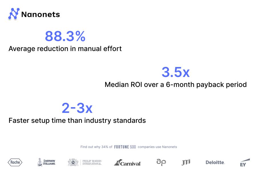 Trusted by over 1,000 enterprises, including industry giants like Bosch, P&G, EY, and Doordash, Nanonets boasts 50,000+ users across 50+ countries.
