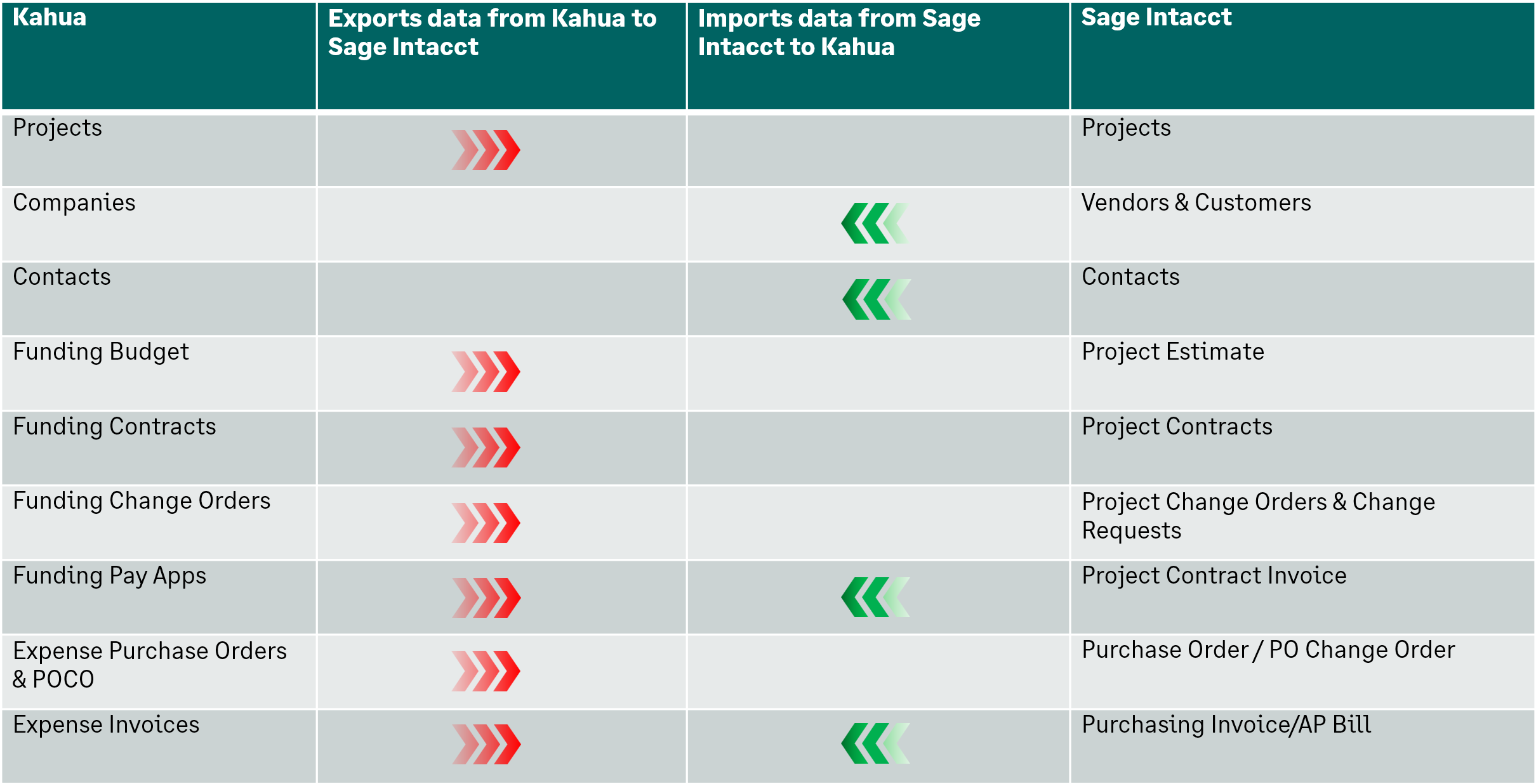 The Kahua integration with Sage Intacct delivers the ability to manage construction projects, contracts, change orders, and other operational aspects in Kahua leveraging Sage Intacct to facilitate purchasing, invoicing, and accounting as it relates to the construction projects.