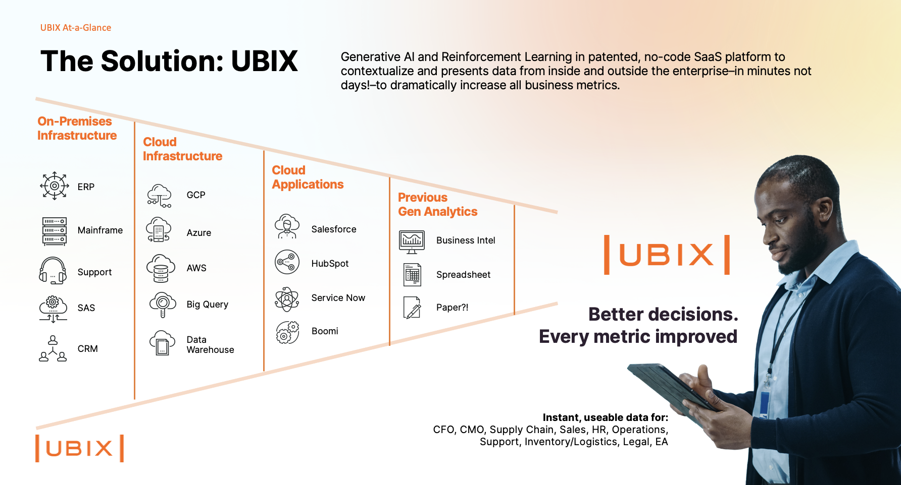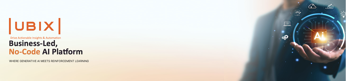 UBIX, a pioneer at the intersection of Generative AI and Reinforcement Learning, delivers the right data to the right business leader at the right time, improving daily decisions that impact productivity, waste, compliance, growth, and profitability. Our patented no-code SaaS platform optimizes real-time business decisions without the need for specialized tools and resources by contextualizing and presenting data from inside and outside the enterprise in minutes not days. We modernize AI and ML innovation for digital transformation success enabling businesspeople to directly participate in AI innovation.