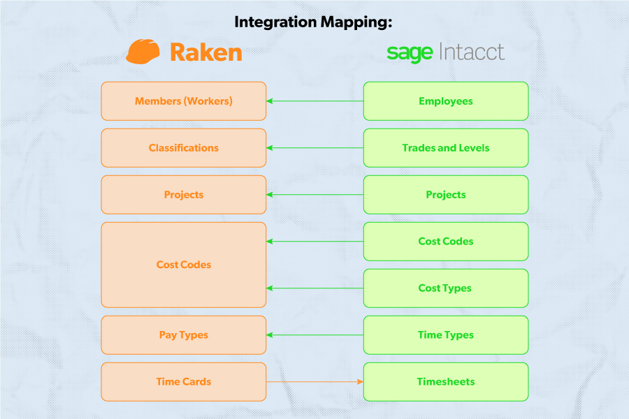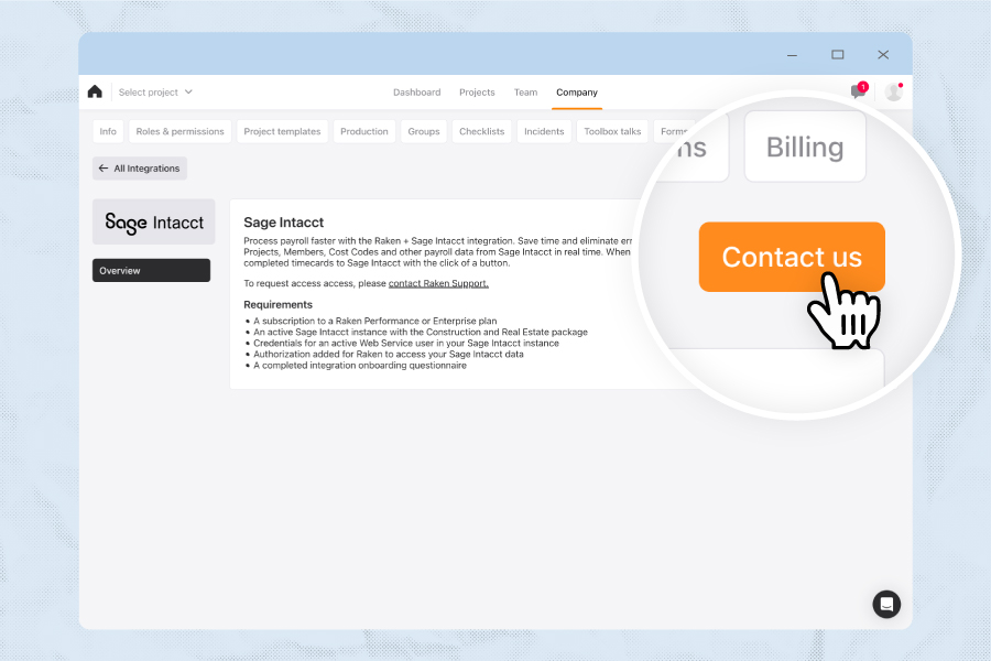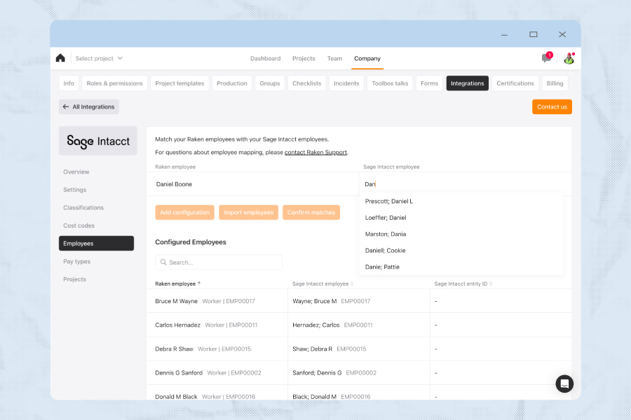 Raken’s Sage Intacct integration automatically syncs critical project and employee data, including completed time entries, to simplify job costing and payroll, save time and ensure accuracy.