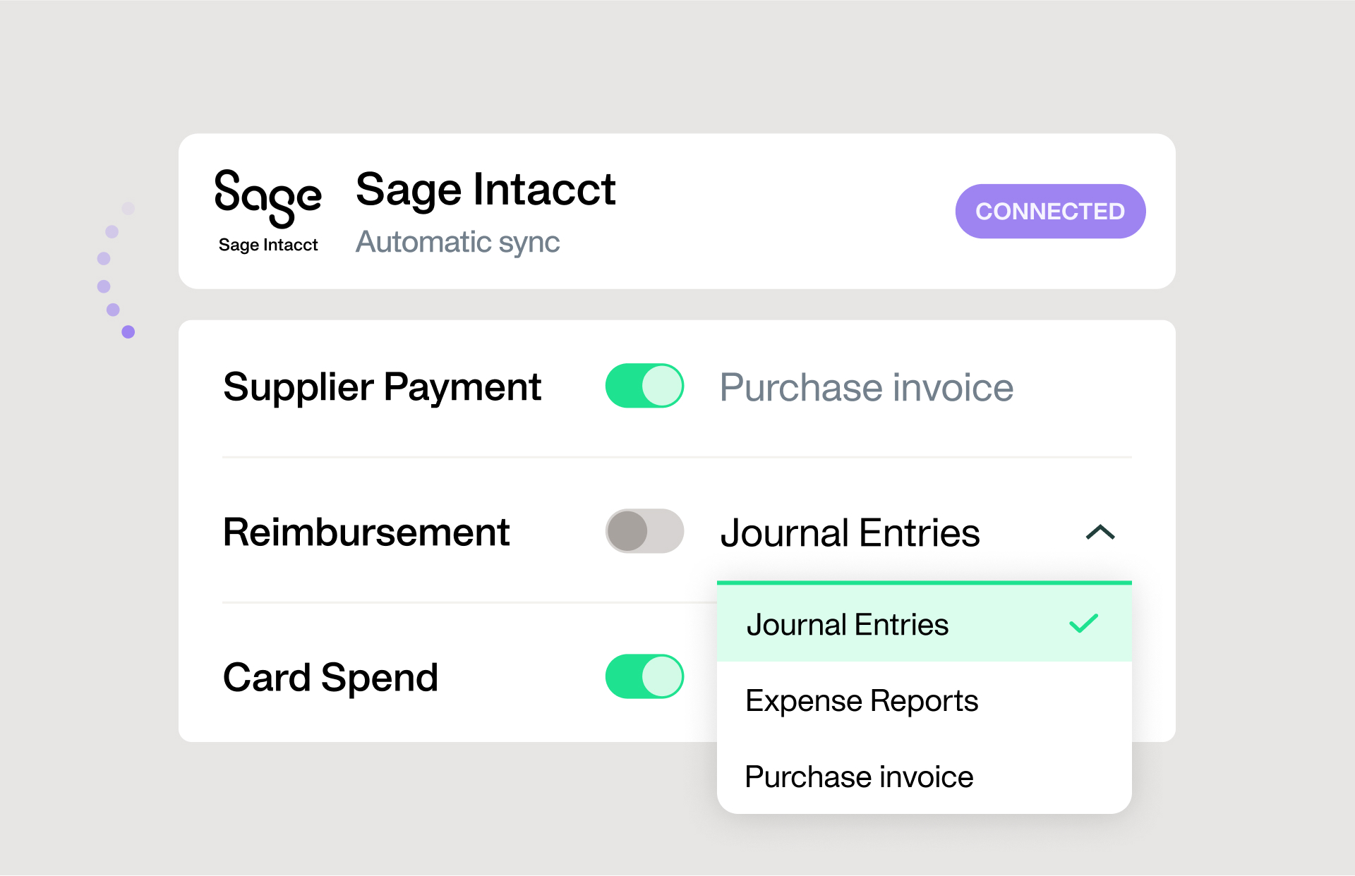 Forget about complex reconfigurations. Ensure seamless data transfer with an integration that just works. Sync your transactions to Sage Intacct with a click, fitting your existing process. Manage different types of spend like cards, employee reimbursements, and supplier payments with a connector supporting:
