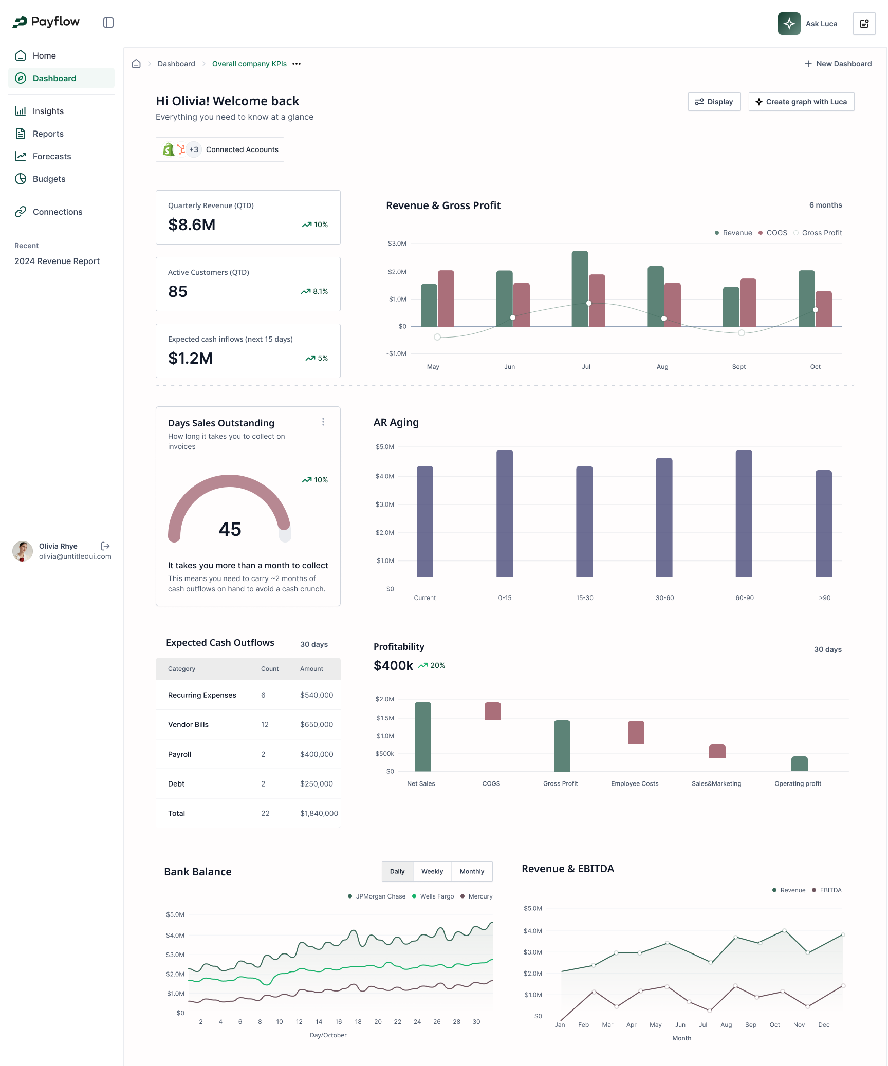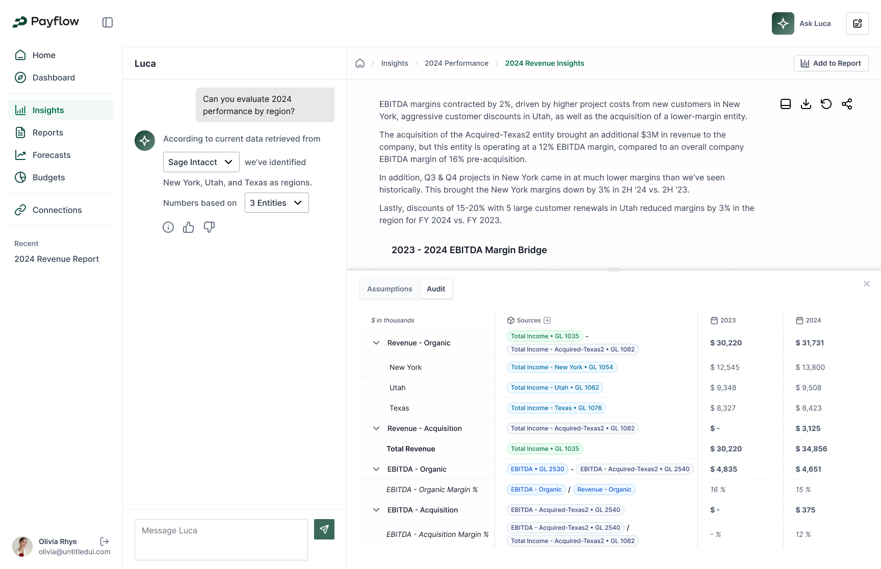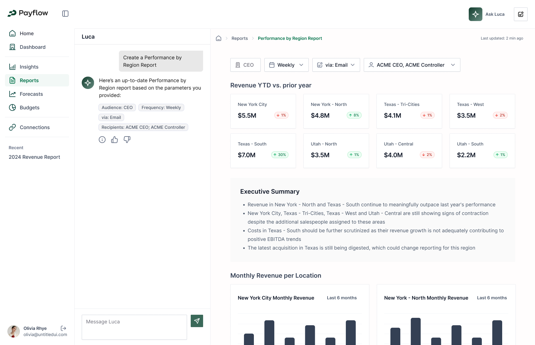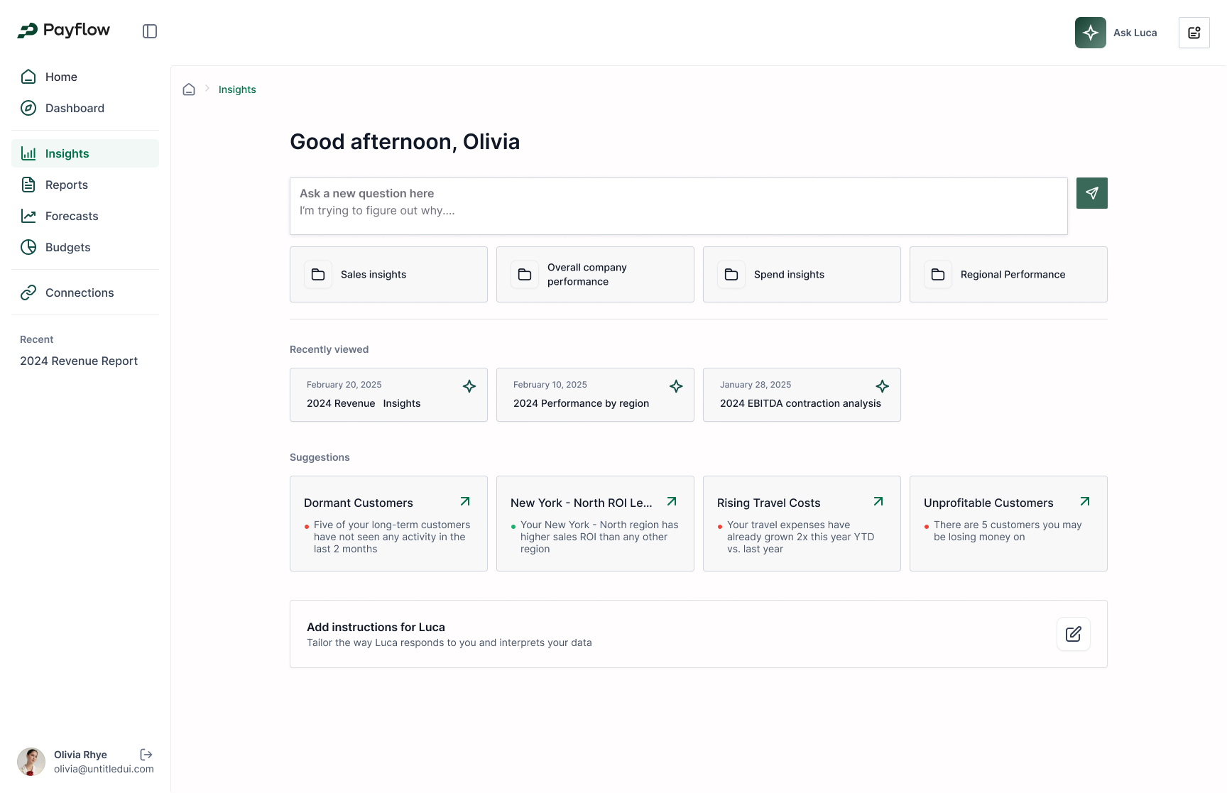 Payflow is building Luca, an AI FP&A analyst agent. Luca plugs into your company’s ERP (Sage Intacct), CRM, HRIS, and other core systems, to provide executives with deep financial insights, comprehensive reports, detailed KPI dashboards and granular forecasts. Luca helps companies answer comprehensive questions and highlight critical insights about financial performance; it can also create weekly, monthly or quarterly reports for executives or the company’s board, calculate and pull KPIs from disparate systems, or build context-rich forecasts with detailed assumptions and sources, all for a fraction of the cost of an FP&A analyst.