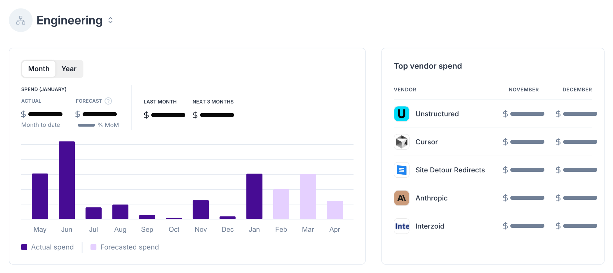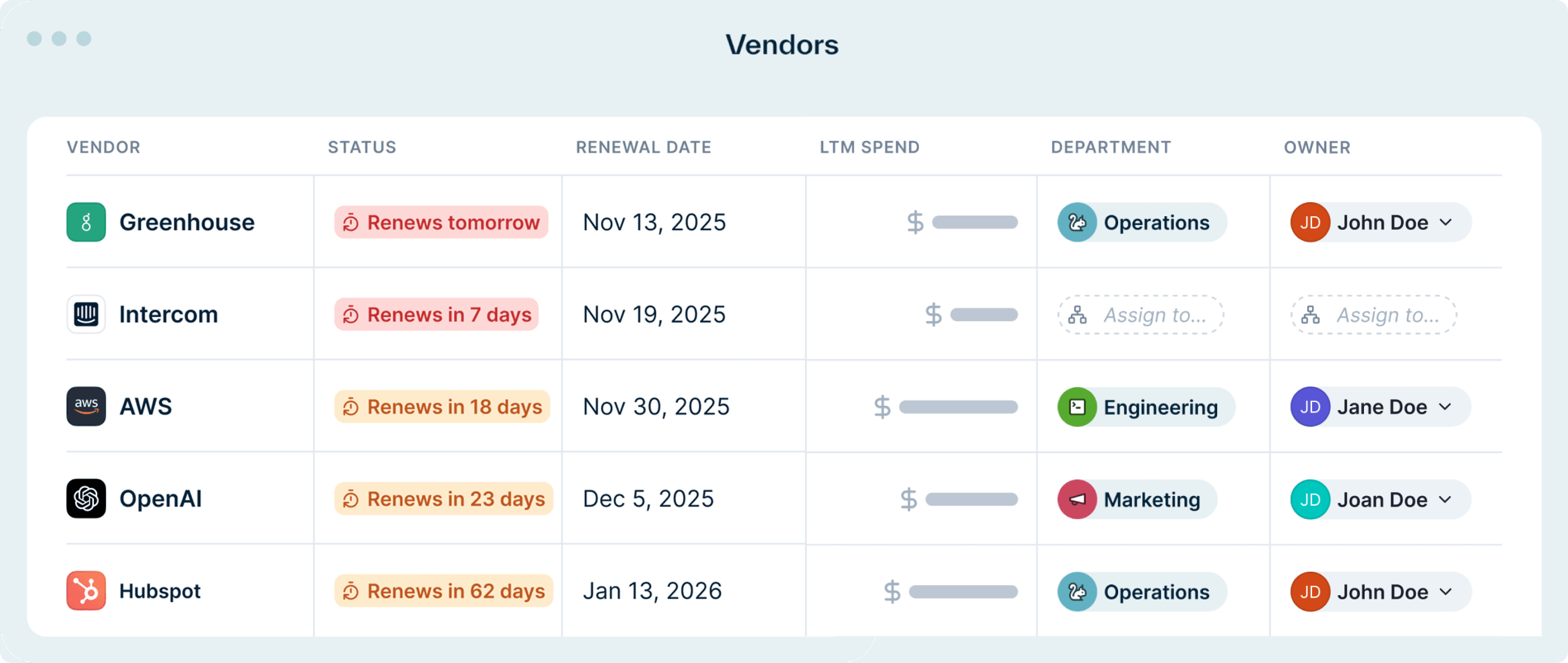 Quickly and easily view the different vendors that each of your departments is using, assign owners, and view how that spend compares to the budget