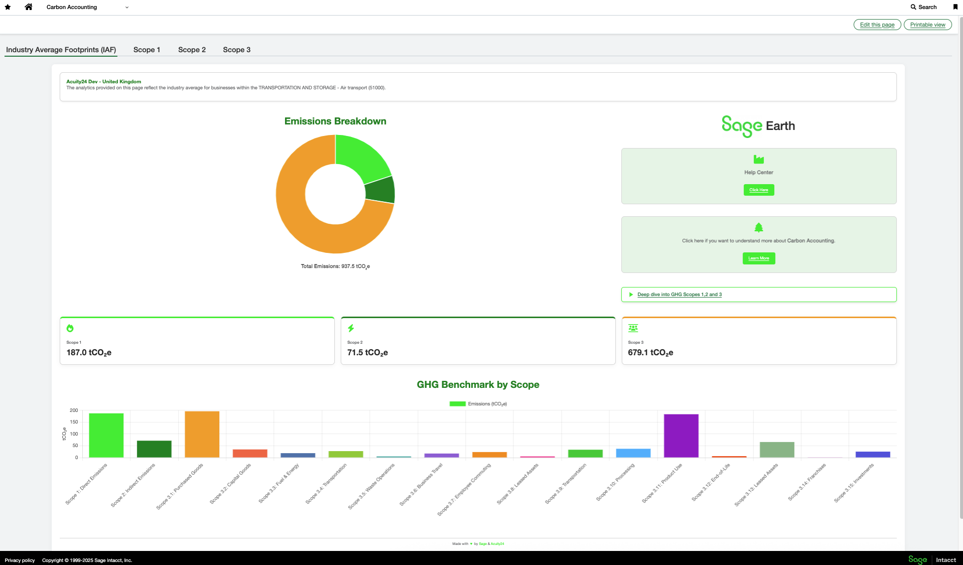 Sage Earth’s API has been brought to life by Acuity24, a leading Sage partner, providing an opportunity for all Sage Intacct customers to gain a greater understanding of their carbon impact at <b>no extra cost.</b> <br><br>