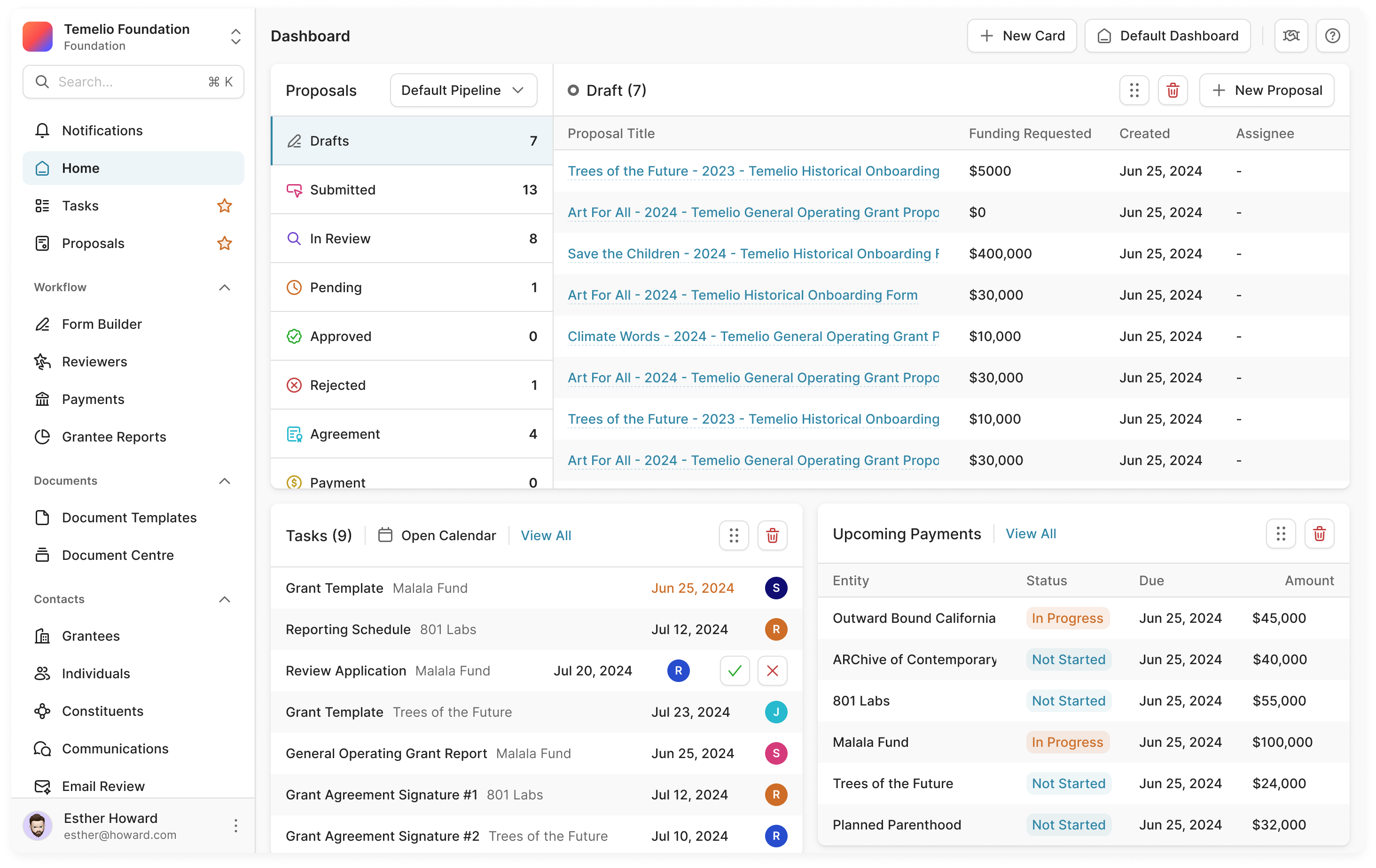Temelio is a modern, flexible, and user-friendly grants management system that combines powerful CRM capabilities, workflow automation, built-in communications, customizable dashboards, AI enhancements, and robust integrations—all backed by included white-glove support. Whether you're a small or mid-sized foundation or scaling rapidly, Temelio streamlines your grantmaking processes so you can focus on strategic impact.