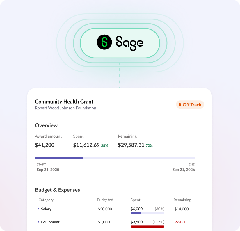 Instrumentl turns fragmented award management into a single, streamlined workflow. Now, with our Sage Intacct integration, everyone at your organization can see award budget vs. actuals, monitor spend-down, and quickly spin-up reports — all in the same workplace where grant deadlines, documents, and compliance requirements already live. More efficient spending. Less manual work.