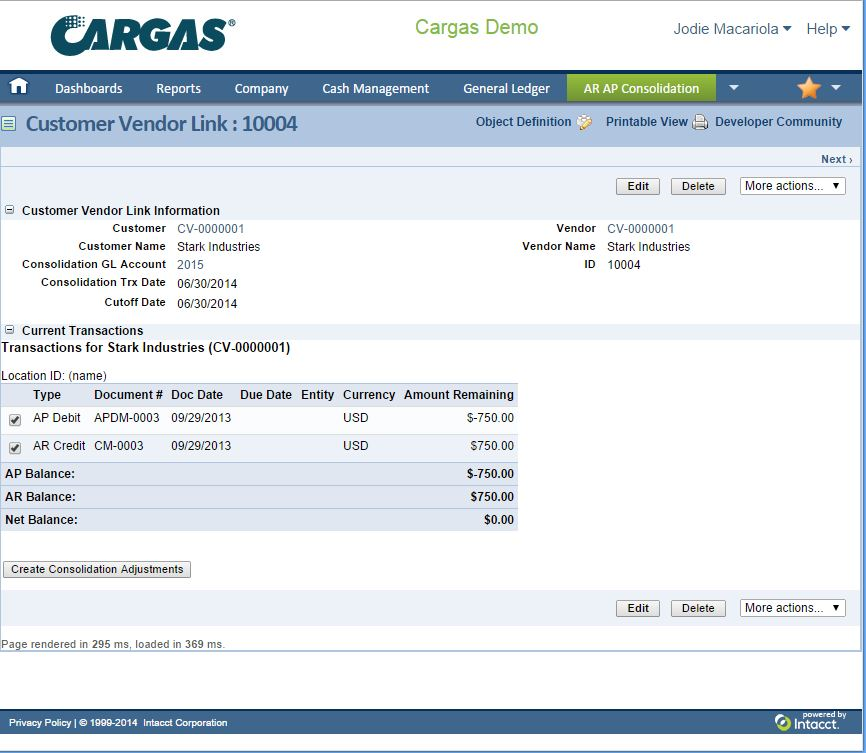 The Cargas AR-AP Consolidator supports businesses with contacts that are both customers and vendors. The Consolidator links customer and vendor records and creates matching adjustments. This way, invoices and vendor bills can be cross-applied, and you can eliminate the headache of exchanging payments for both a customer invoice and a vendor bill. The Consolidator also helps prevent you from paying a vendor that has an outstanding balance.