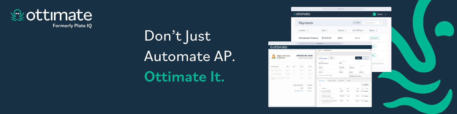 Ottimate (formerly Plate IQ) transforms your AP department into a profit center instantly. With our artificial intelligence, you can skip manual data entry and automatically digitize invoices down to the line item to power approval workflows, payments, statement reconciliation and reporting.